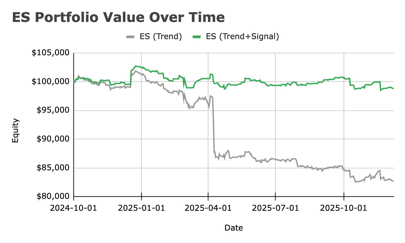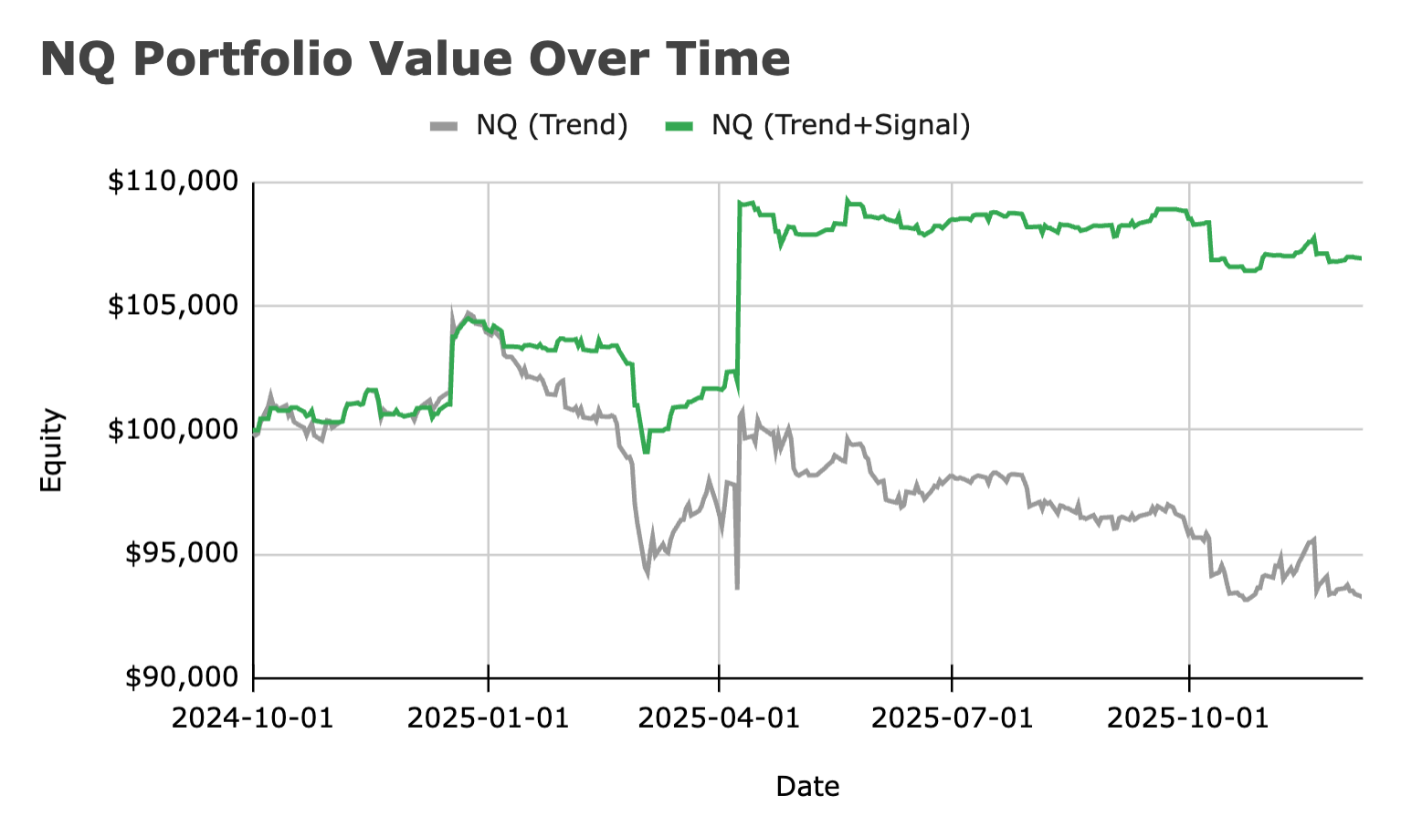 - NQ: trend-only drawdown → Trend+Signal profitability