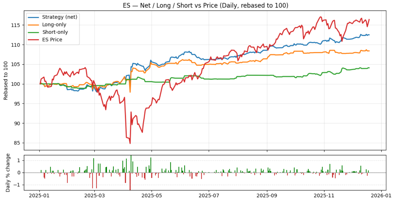 For ES in 2025, the strategy tends to track the underlying’s movements closely (directionally), with a smoother net curve relative to the index path (see the 2025 ES chart).